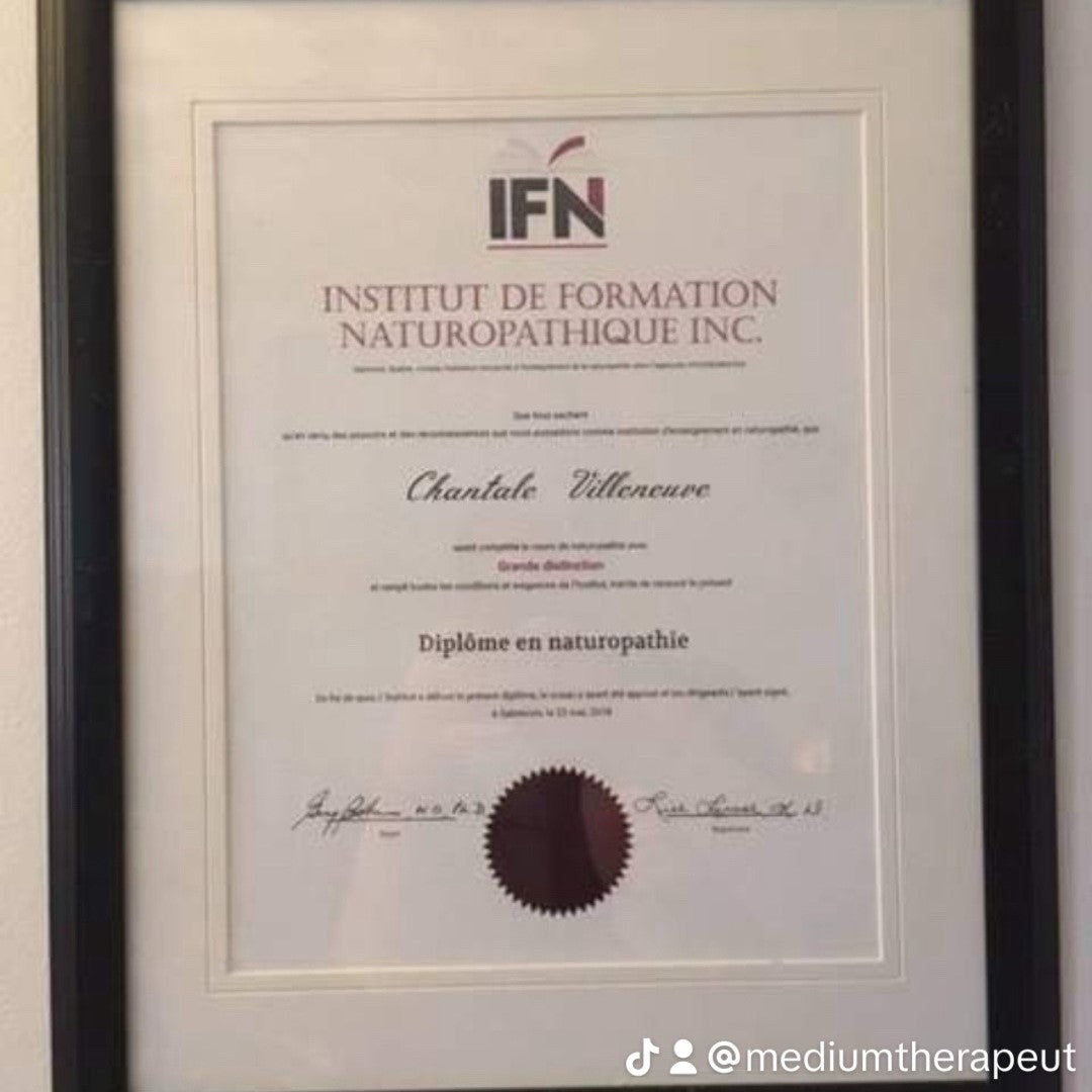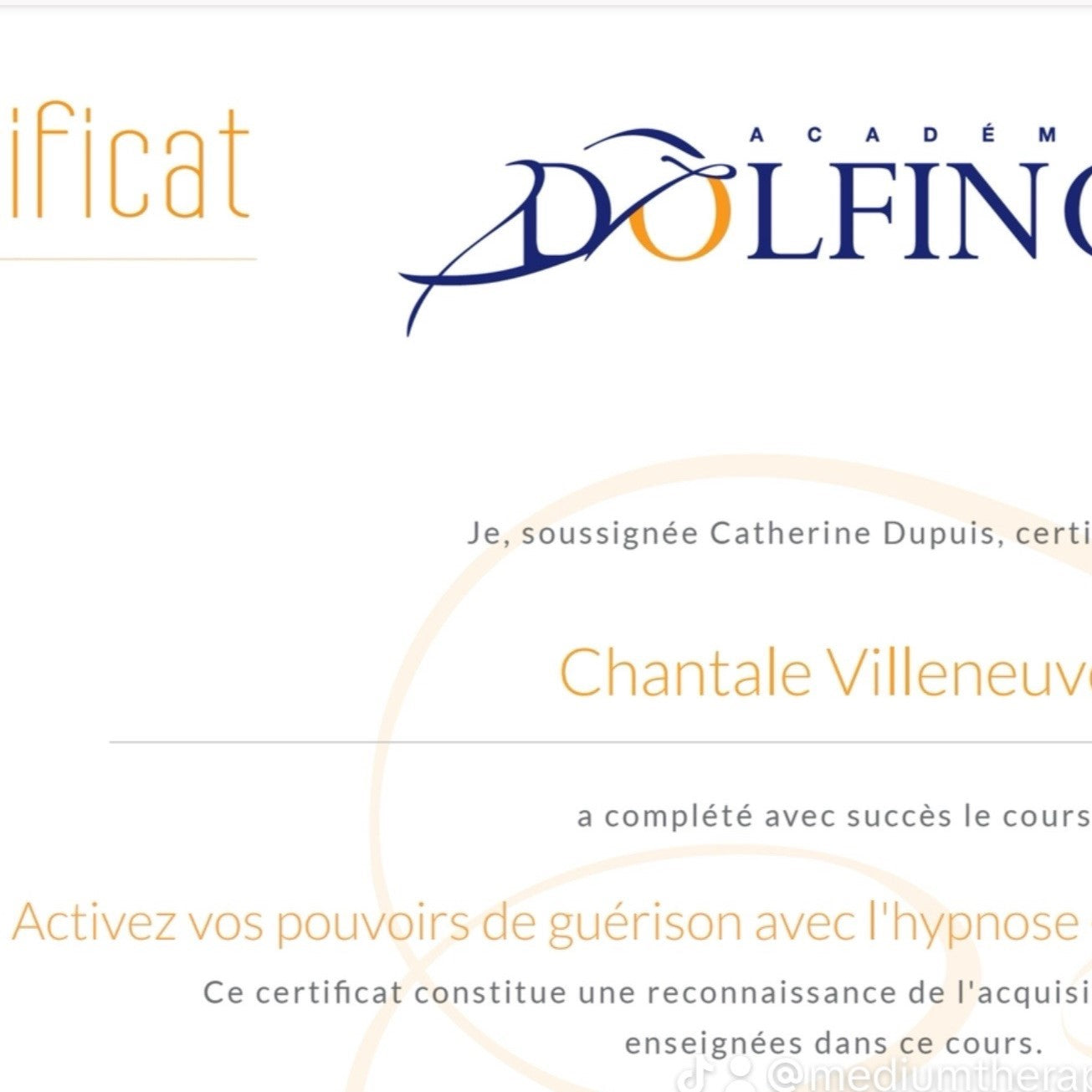 À propos de Chantale Villeneuve – Médium Thérapeute, Hypnothérapeute & Naturopathe Bienvenue dans mon univers, un espace où la guidance spirituelle, la guérison et la transformation profonde se rencontrent. Je suis Chantale Villeneuve, médium hypnothérapeute et naturopathe, cumulant plus de dix ans d’expérience en naturopathie (IFN/membre de l’AINH, du collège des Naturopathes du Québec, praticienne société Éduco Santé) et hypnothérapie clinique (Dolfino), et maintenant deux ans d’expérience en tant que médium thérapeute. Mon chemin est guidé par une mission claire : aider les âmes à se libérer, à se reconnecter à leur essence divine et à atteindre un bien-être profond sur tous les plans.